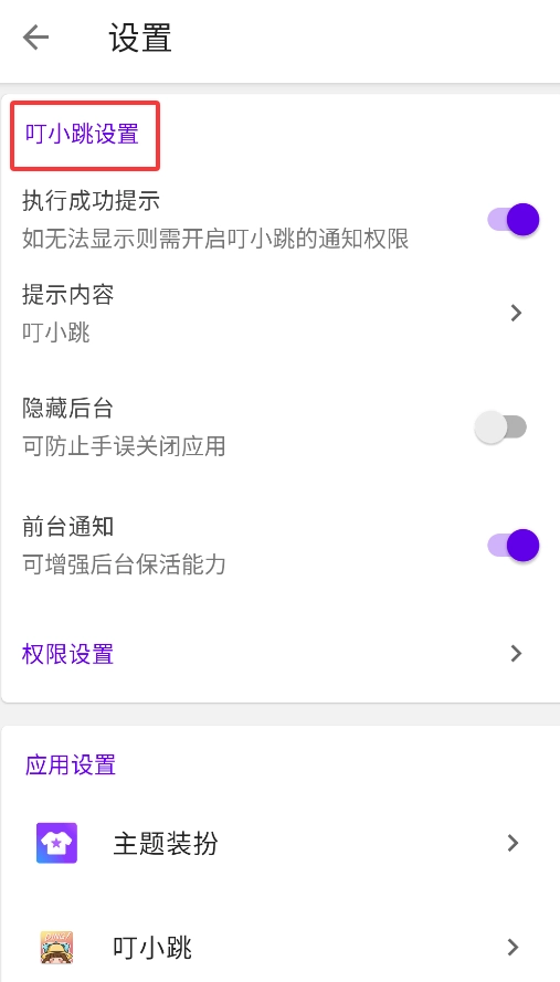 在设置中心,能够对叮小跳的提示内容、后台运行隐藏状态以及前台通知等个性化规则进行配置。