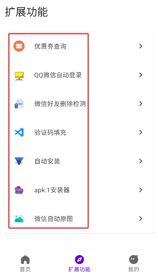 通过扩展功能板块,能够使用优惠券查询、自动登录、好友检测以及验证码填充等工具。
