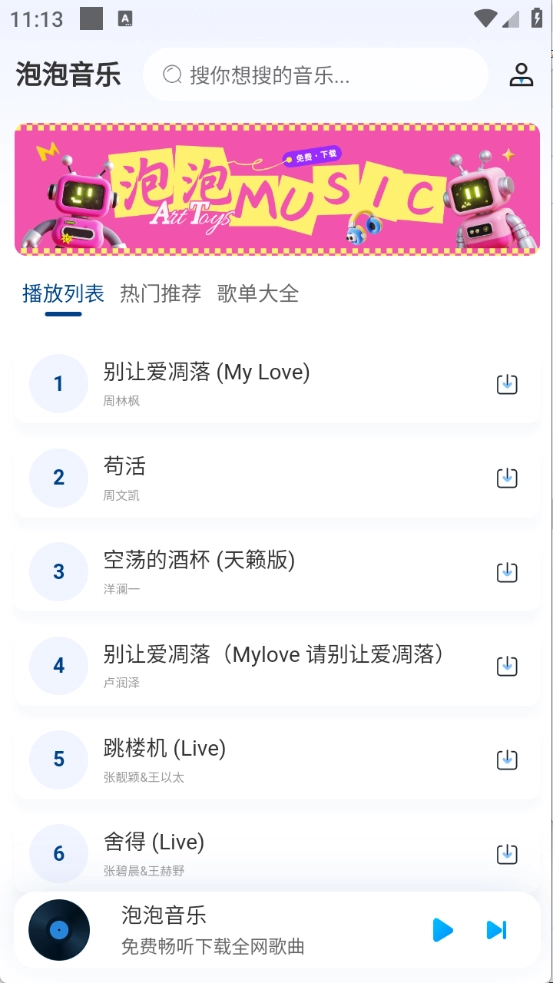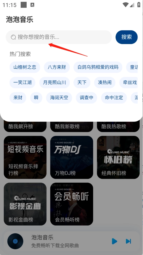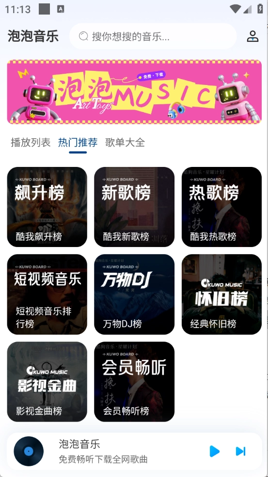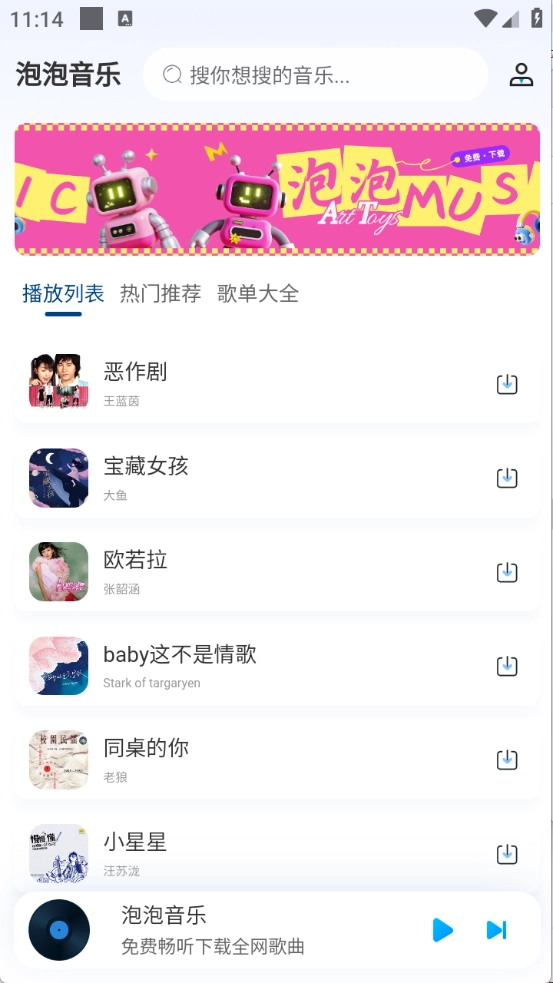 泡泡音乐是专为音乐爱好者打造的听歌利器,这里汇聚了海量音乐资源,无论是当下热门新歌还是经典老歌都应有尽有,每一首都是备受欢迎的作品。平台设有细致的音乐分类,能为你带来独一无二的专属听歌体验,更有高清音效加持,播放过程毫无杂音干扰,你想听的歌曲在这里都能找到。