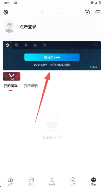 点击“我的”页面选项,或者通过点击置顶活动页,都能进入Steam绑定页面。
