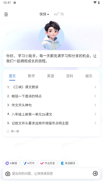 它不只是用来解答疑问的工具,更能成为AI学习搭档,一路陪伴你成长,还能借助话题类游戏让你在互动玩耍中掌握知识。
