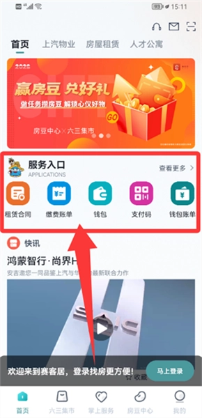 在首页的服务入口处,你可以选择办理租赁合同或者缴费账单之类的业务。