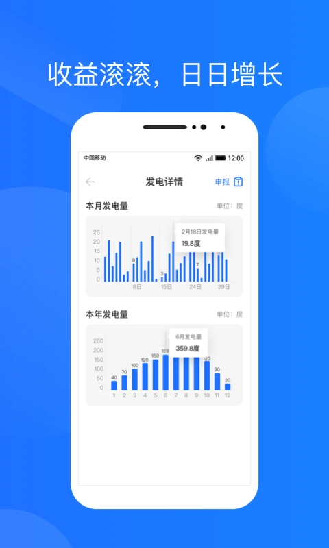 拥有不同的发电量统计图,同时展示了本月的发电量统计图与本年的发电量统计图;