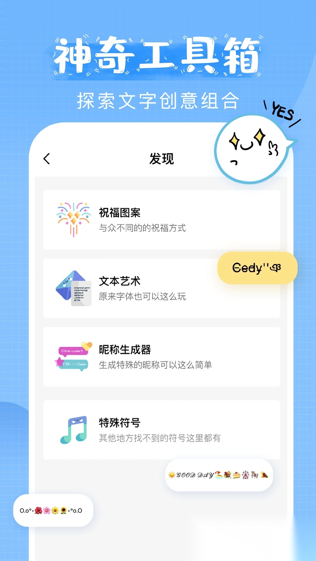 重庆树袋熊信息技术有限公司打造的萌文字应用,是一款聚焦个性化表达的手机输入工具。借助这款软件,用户可以轻松输入各种俏皮可爱的艺术字体——无论是活泼的萌系文字,还是丰富的颜表情符号,都能自由创作花样文本。应用里还整合了不少实用小工具,正等着用户去探索体验。