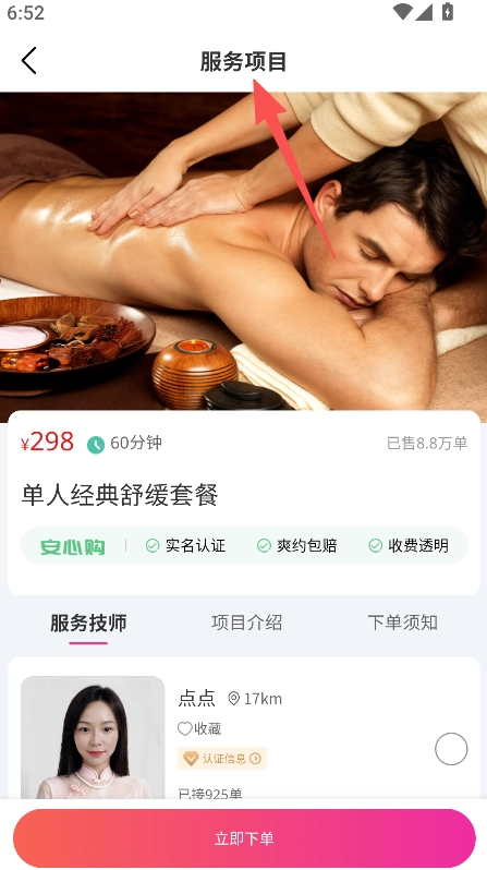 查看项目介绍选定技师后点击立即下单。