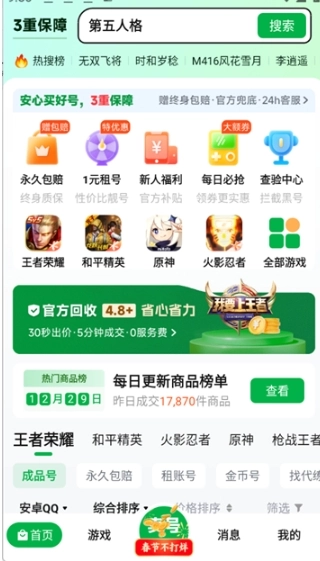 首页提供多种游戏账号类型,涵盖王者荣耀、蛋仔派对、和平精英等热门游戏。