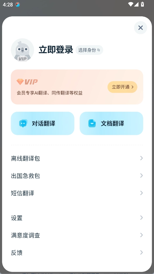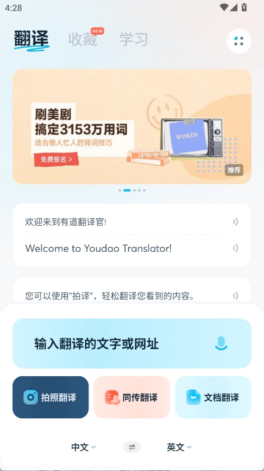 有道翻译官最新版,翻译界面提供了文本、拍照、文档等翻译方式