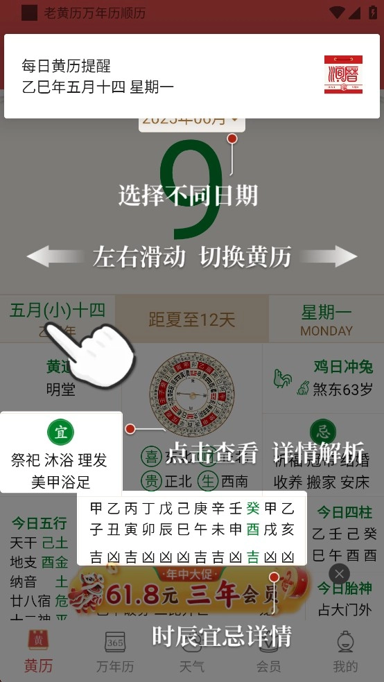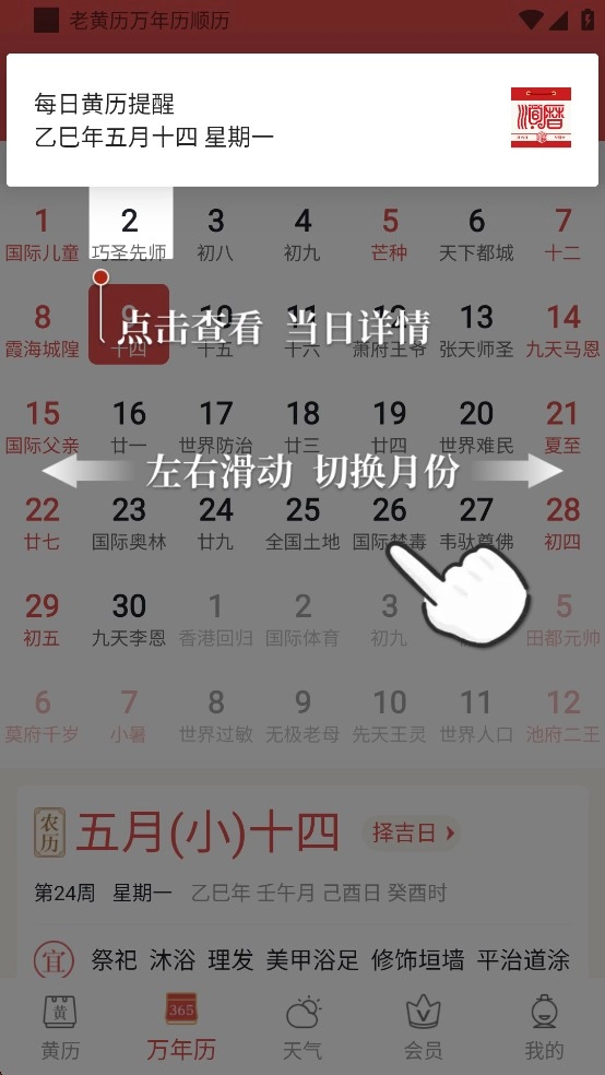 顺历老黄历日历可向用户提供专业黄历、万年历、黄历天气、节气养生、个人运势等各类信息的查询服务,用户能依据自身需求进行自定义设置,自由查询每日适宜开展的事务。