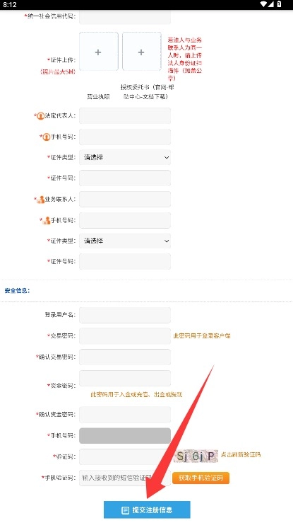 请完整填写基础信息、企业信息和安全信息,输入手机验证码后,点击提交注册信息按钮。