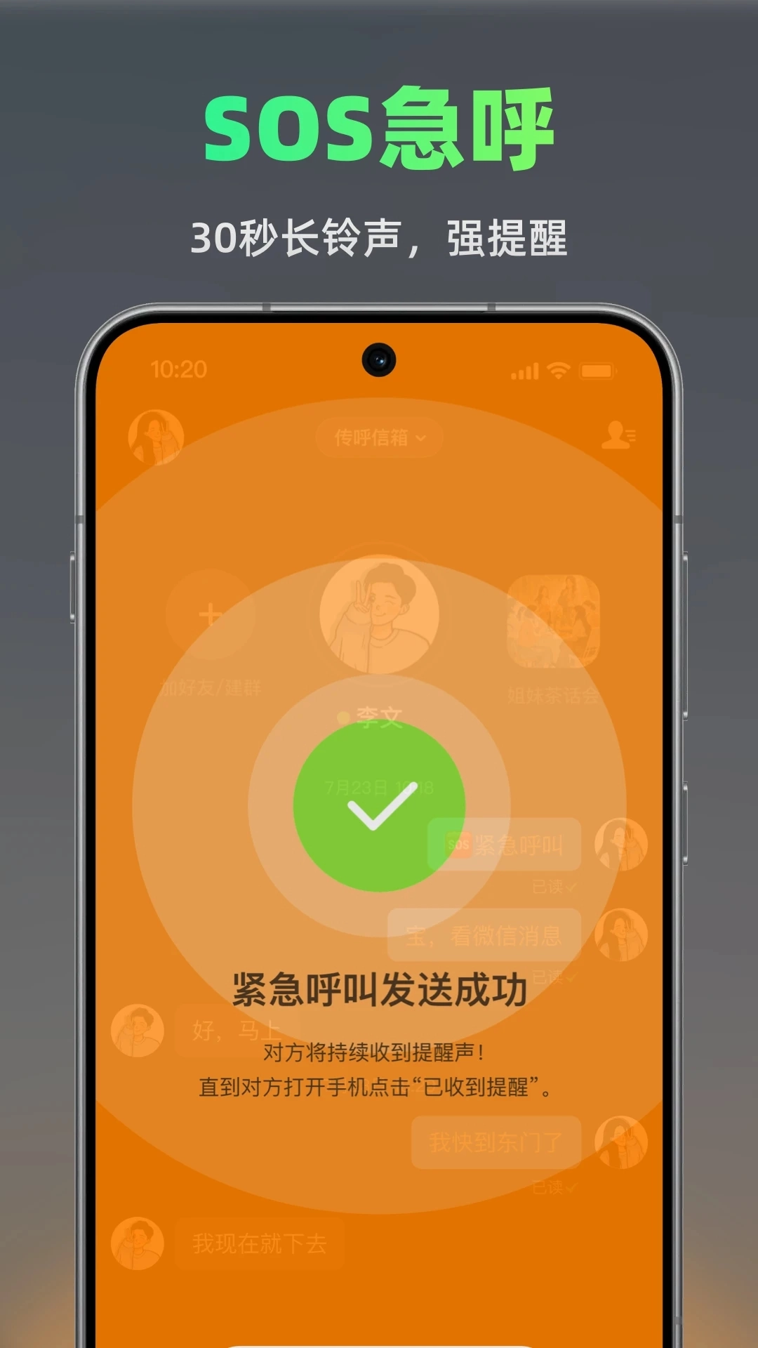 SOS模式会自动触发最高级别的提醒机制,以持续强烈的提醒方式发送消息,直至接收方确认已收到该消息。