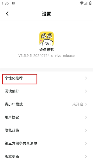 3、点击一下就会来到“设置”页面中,选择并点击列表中的“个性化推荐”选项。