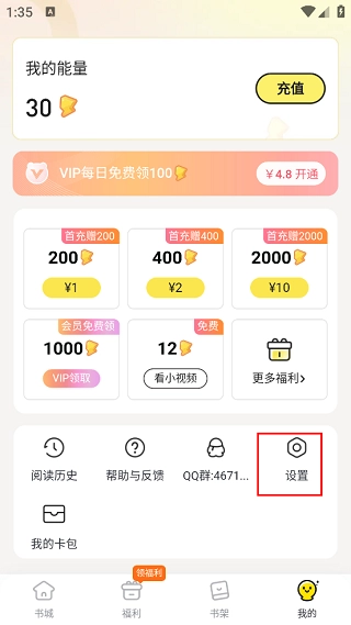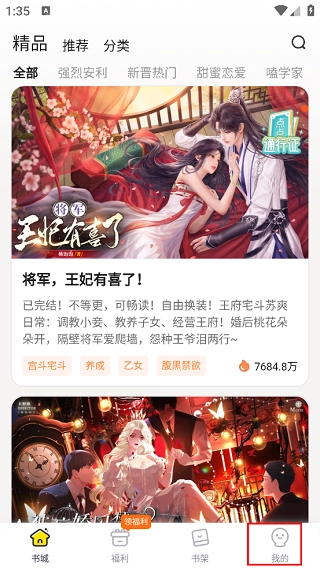 打开手机里的点点穿书应用,进入“书城”页面,这里有海量正版优质小说资源可供用户选择,接着点击底部导航栏最右边的“我的”选项。