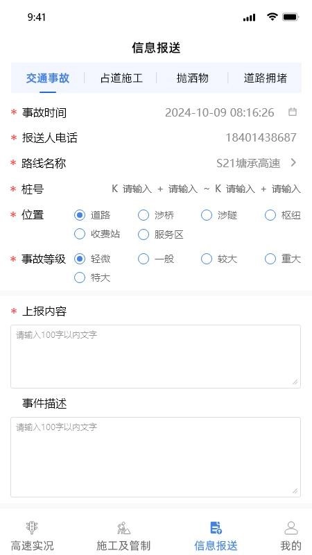 具备强大的信息报送能力,可在线自定义编辑并提交事故、占道、拥堵等各类相关信息。